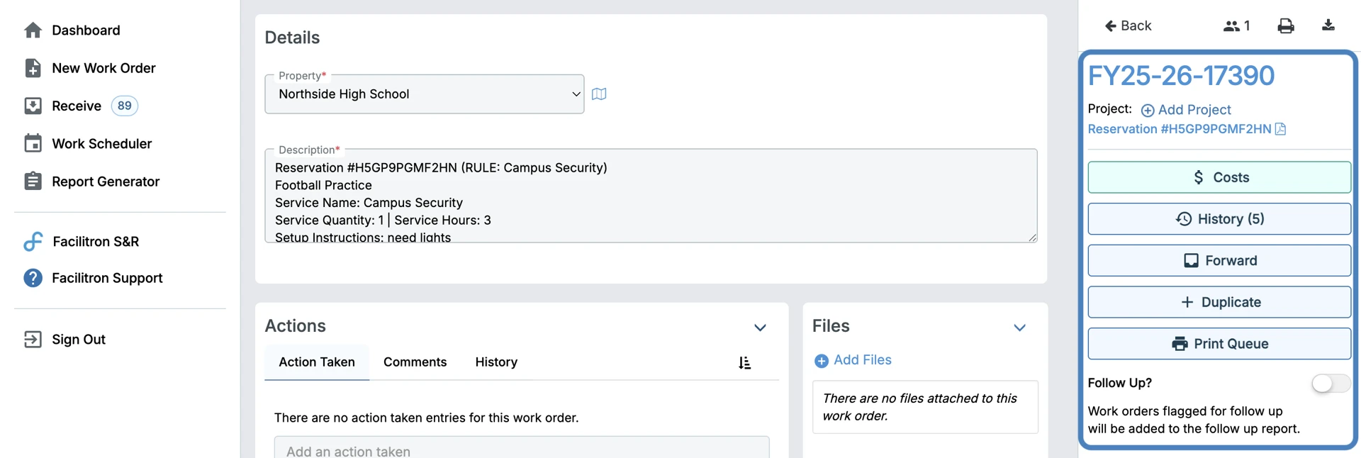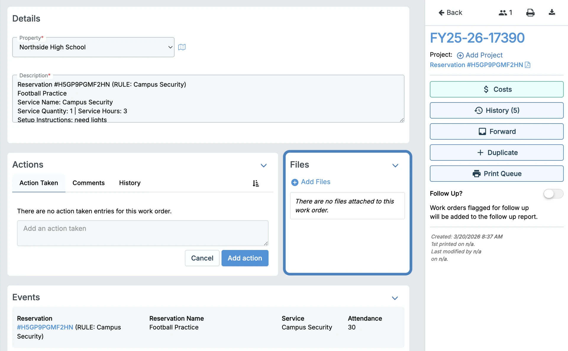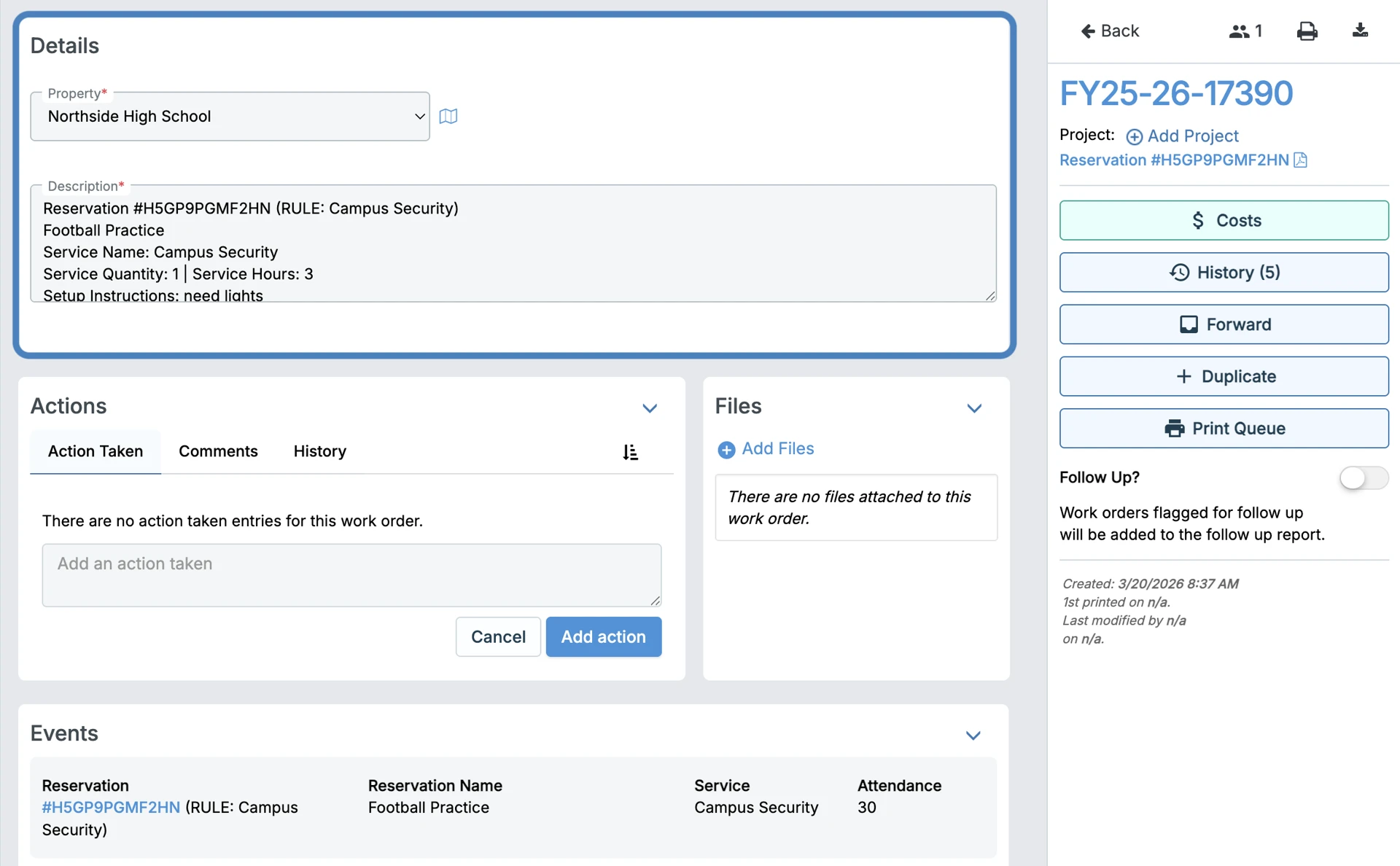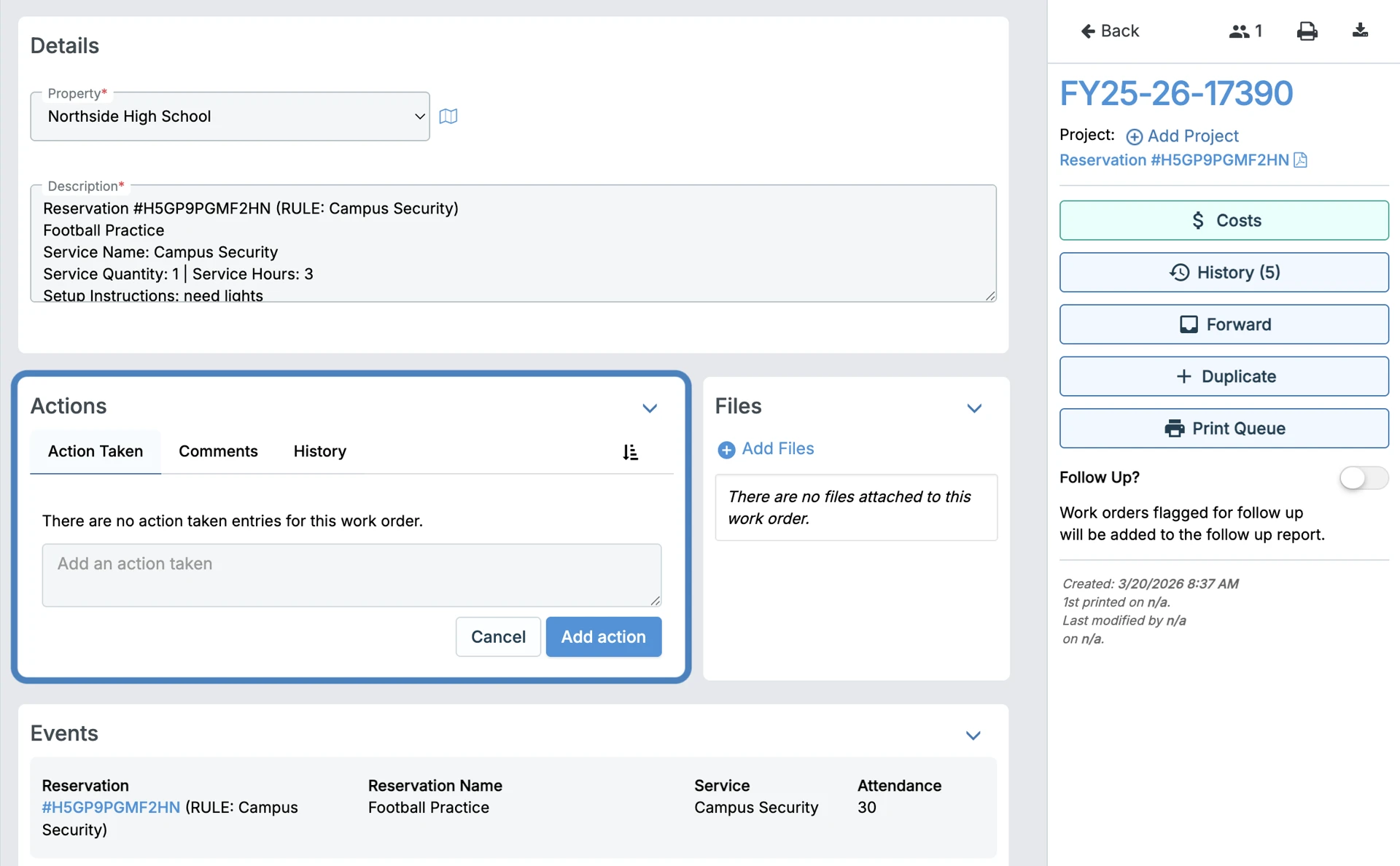 The Action Taken section will list anything written by the maintenance worker to describe their work. The History tab will show all activity on the work order from creation to completion.