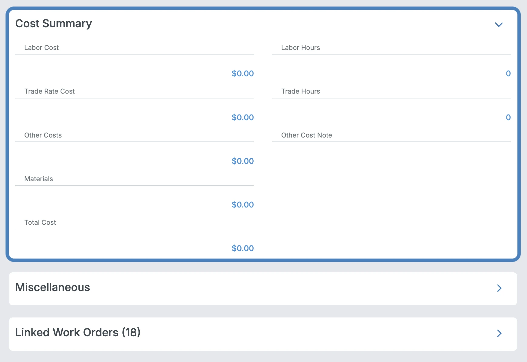 The Cost Summary summarizes all the costs associated to the work order. The data is populated from the Cost button.
