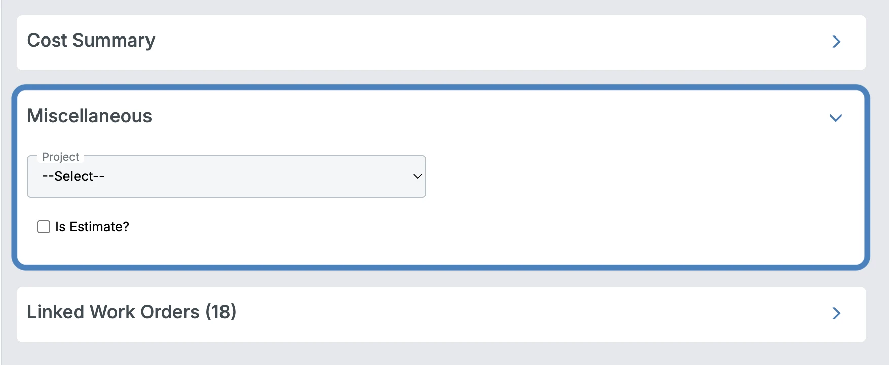 Under Miscellaneous, you can select a project if applicable, or check Is Estimate? to identify the work order as an estimate by its purpose. By selecting a purpose that is marked as Is Estimate when submitting a request for an estimate, that setting in the Purpose profile causes any work orders with that purpose to be ignored from the various expense/cost reports.