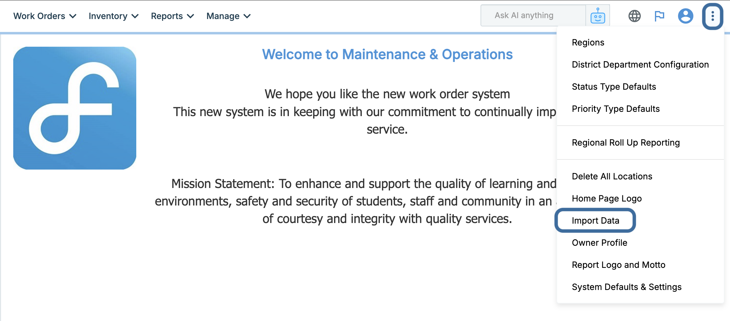 Note: The optional user menu Regional Roll Up Reporting must be added to your role in WORKS to continue. This will give you access to the ellipses icon and corresponding menu options that are shown in the examples below. Please reach out to M&O leadership or your Facilitron account manager to confirm if Regional Roll Up Reporting should be added to your WORKS profile.