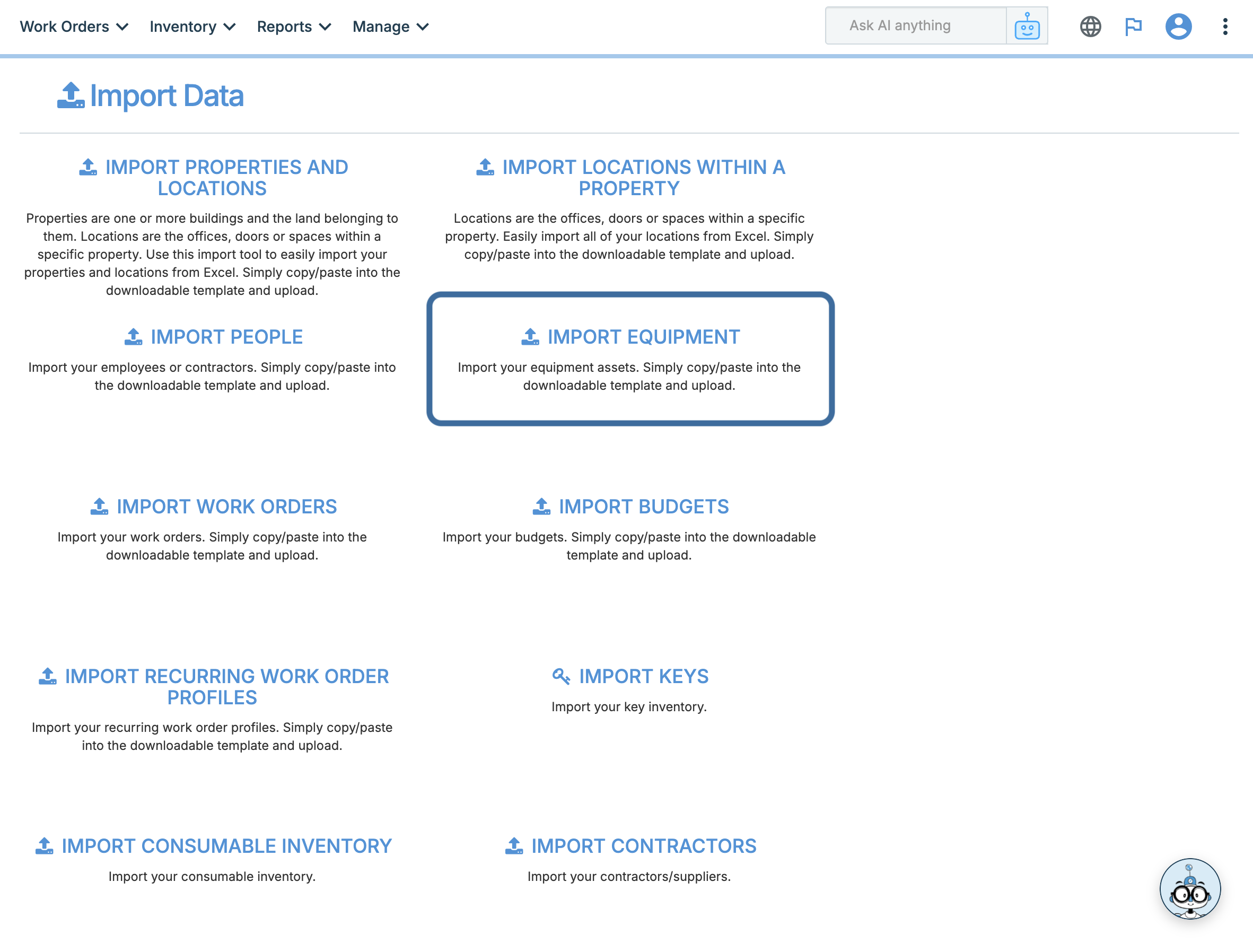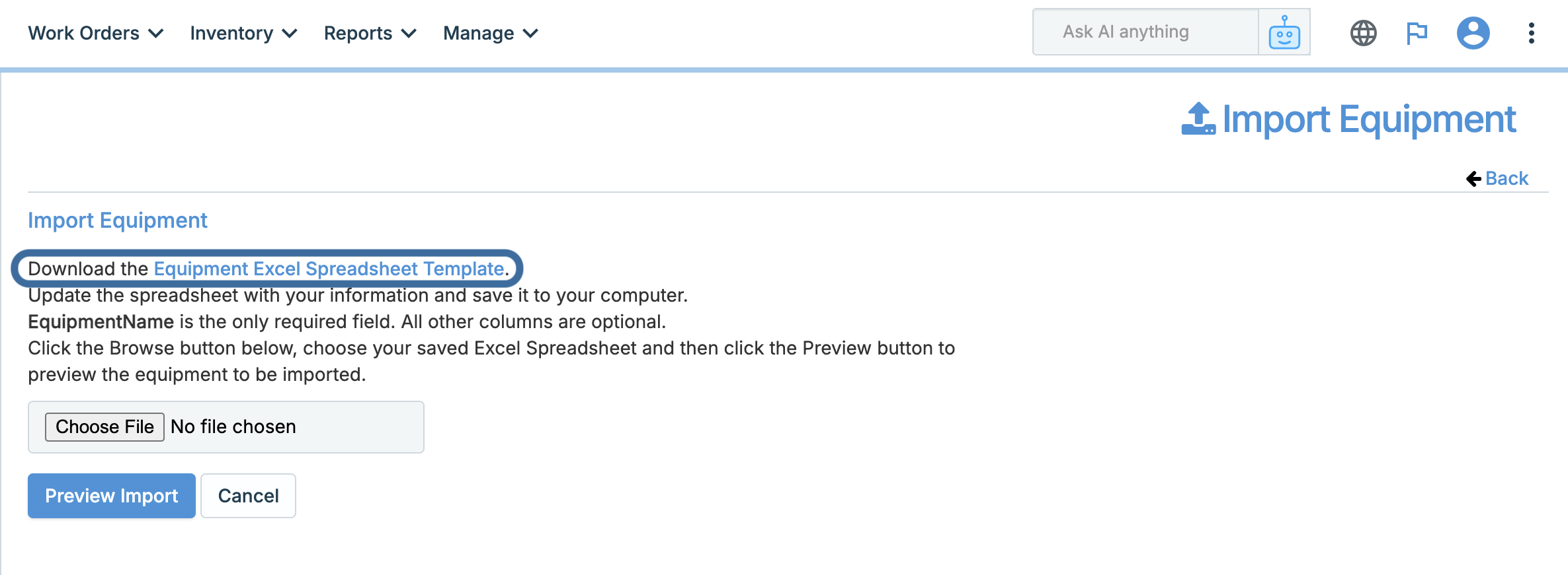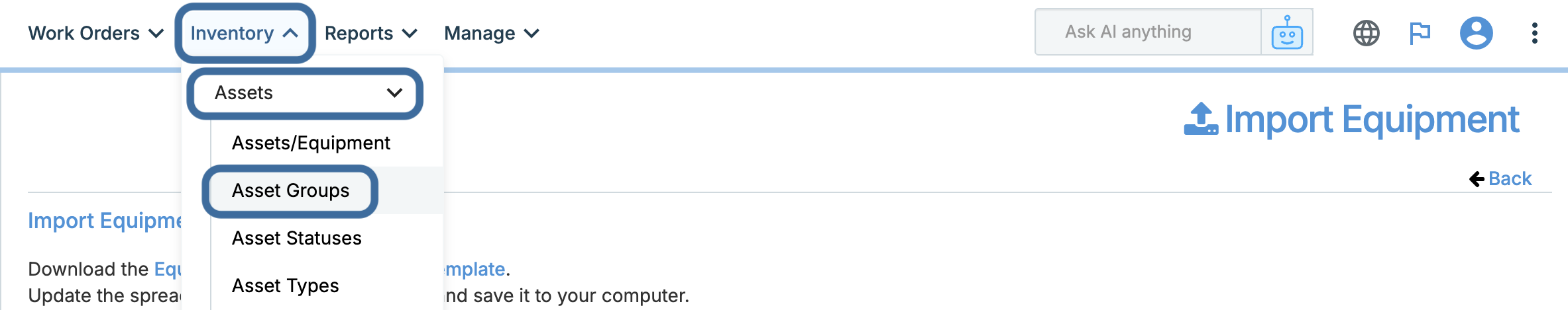 Typically, assets can be uploaded into WORKS by using an export from your accounting system. A formatted Excel spreadsheet template is provided for proper formatting. This template can be found by clicking the vertical ellipses in the upper right corner > clicking Import Data > select IMPORT EQUIPMENT on the next page> click Equipment Excel Spreadsheet Template on the final page to download the template. This process is demonstrated below.