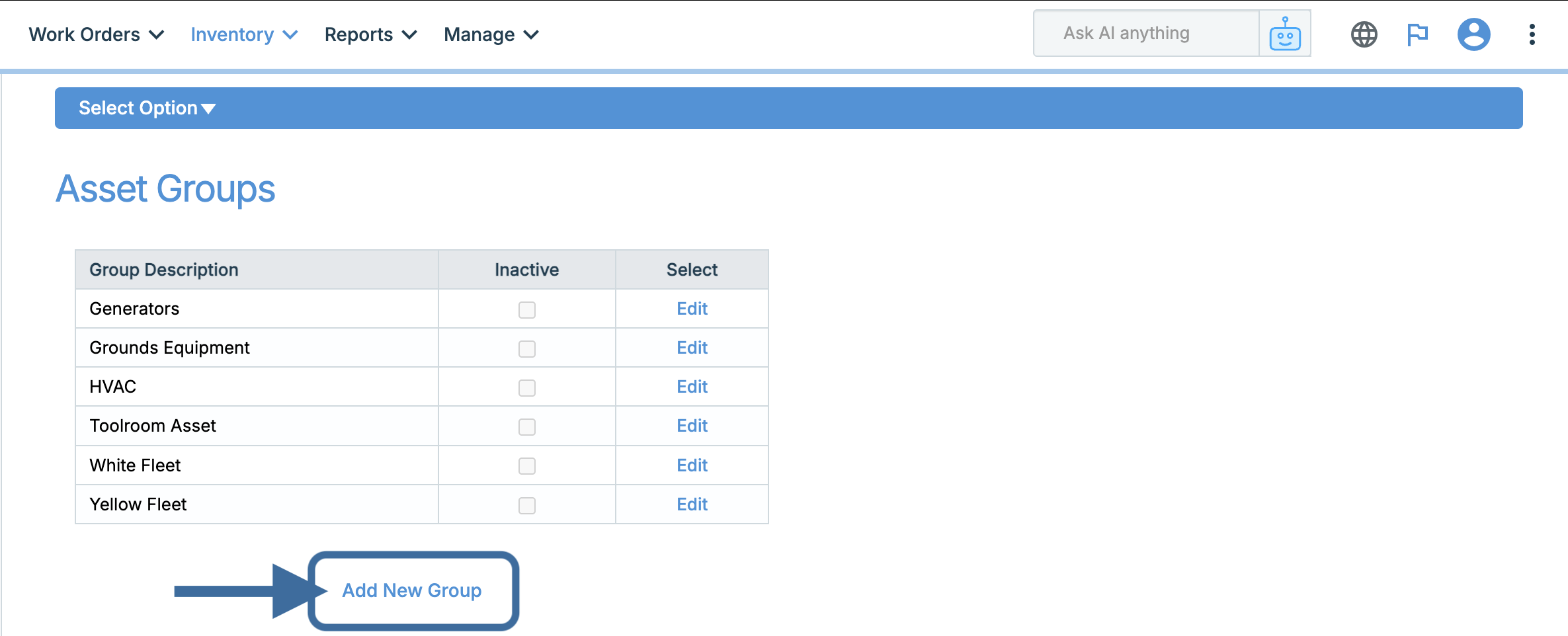 Assets belong to various groups like Generators, HVAC, Vehicles etc. These groupings allow you to appropriately sort your assets lists to focus on the specific type of asset you are working with. Asset groups can be added by going to Inventory > Assets > Asset Groups and clicking Add New Group. To view these groups, you can export asset data by going to Reports > Exporting > Export Asset Data.
