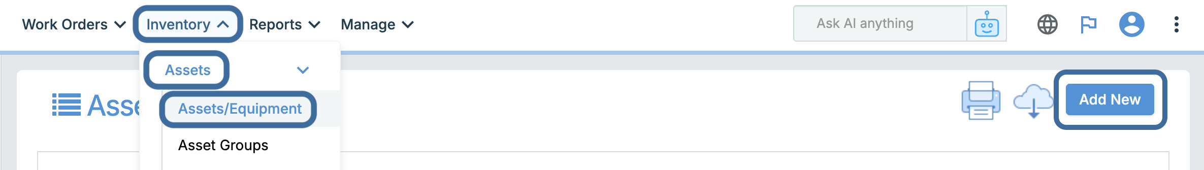 1. Go to Inventory > Assets > Assets/Equipment. Click the blue Add New button.
