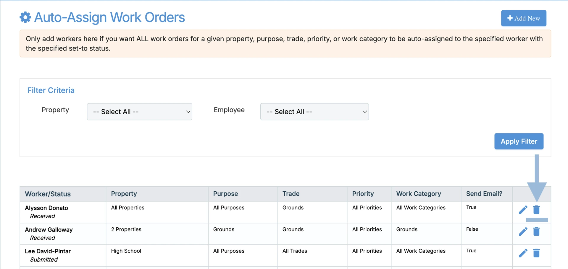 To disable auto assignments, go to Manage > People > Auto-Assign Work Orders. You can filter for the employee using the property or employee filter if helpful. To remove the auto-assignment, simply click the bin icon.