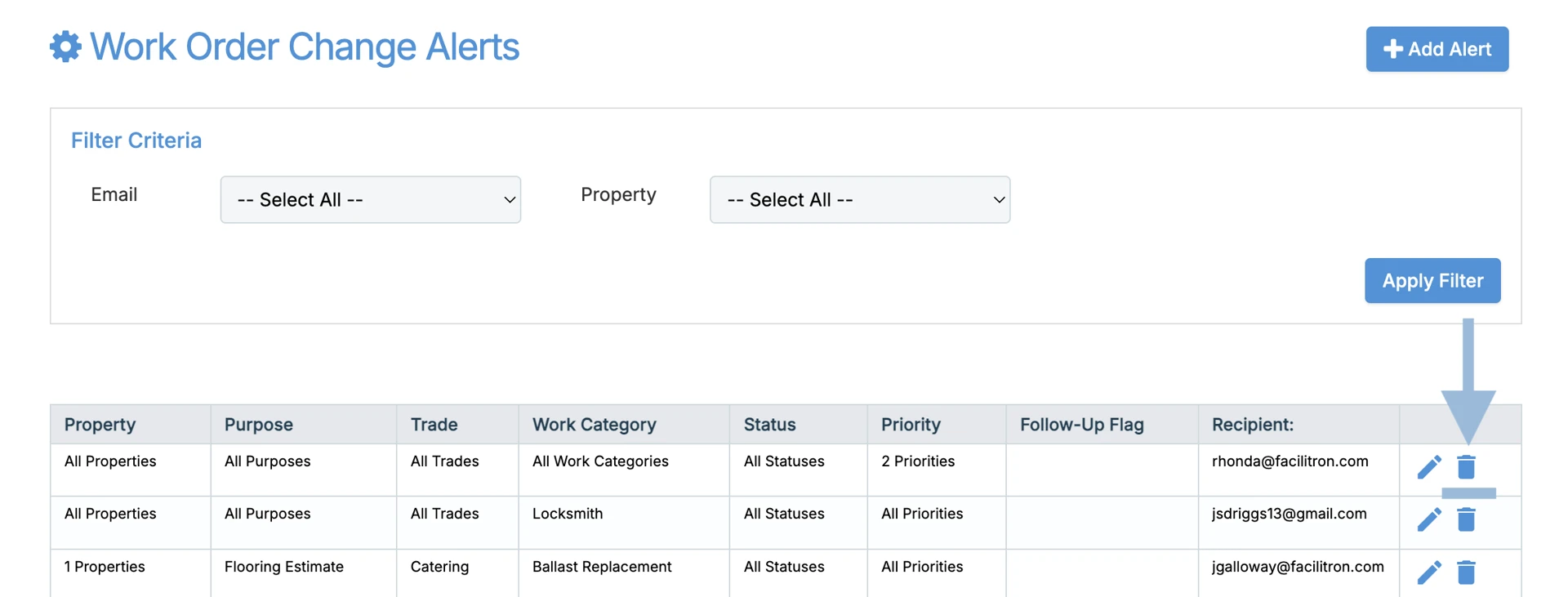 To disable email alerts, go to Manage > Manage Alerts and select the alert that the user should be unsubscribed from. The most common email alerts used are Work Order Origination Alerts and Work Order Change Alerts.