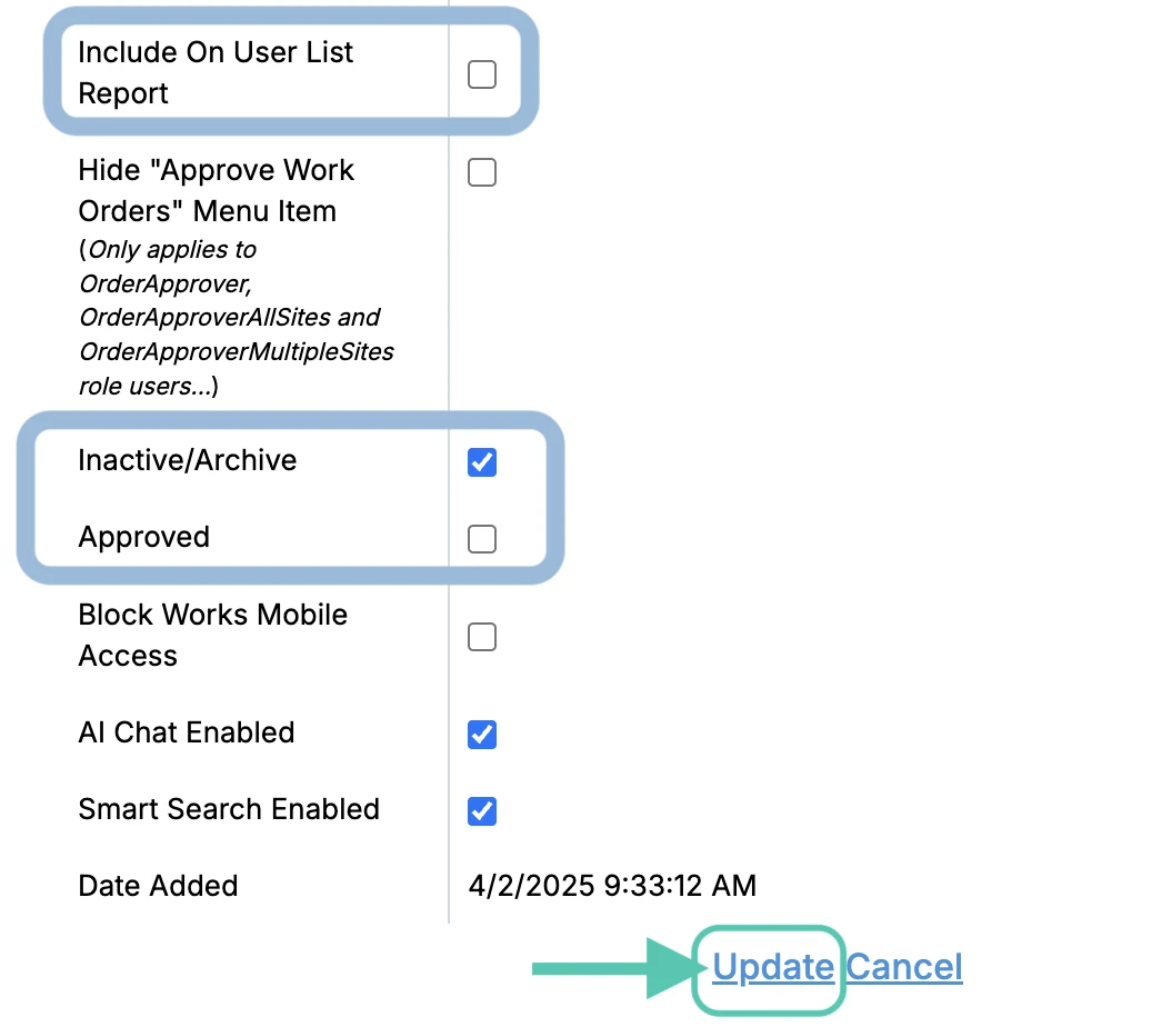 To inactivate the user, open the user profile by going to Manage > People > Users. Click Edit, then check the box next to Inactive/Archive. This is located towards the bottom of the page. Next, you’ll want to uncheck Approved and Include On User List Report.
