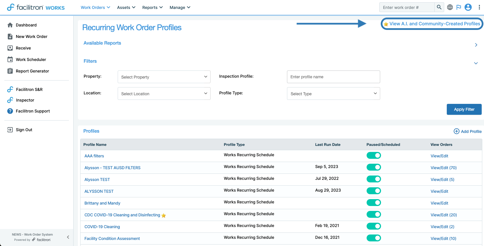 To access the community-created profiles, go to Work Orders > Recurring > Add/Edit Inspection Profile > click "View A.I. and Community-Created Profiles" in the top right. In the "Schedule/Create Recurring Work Orders" area, you will find access to the same page named "View Community-Created Profiles".
