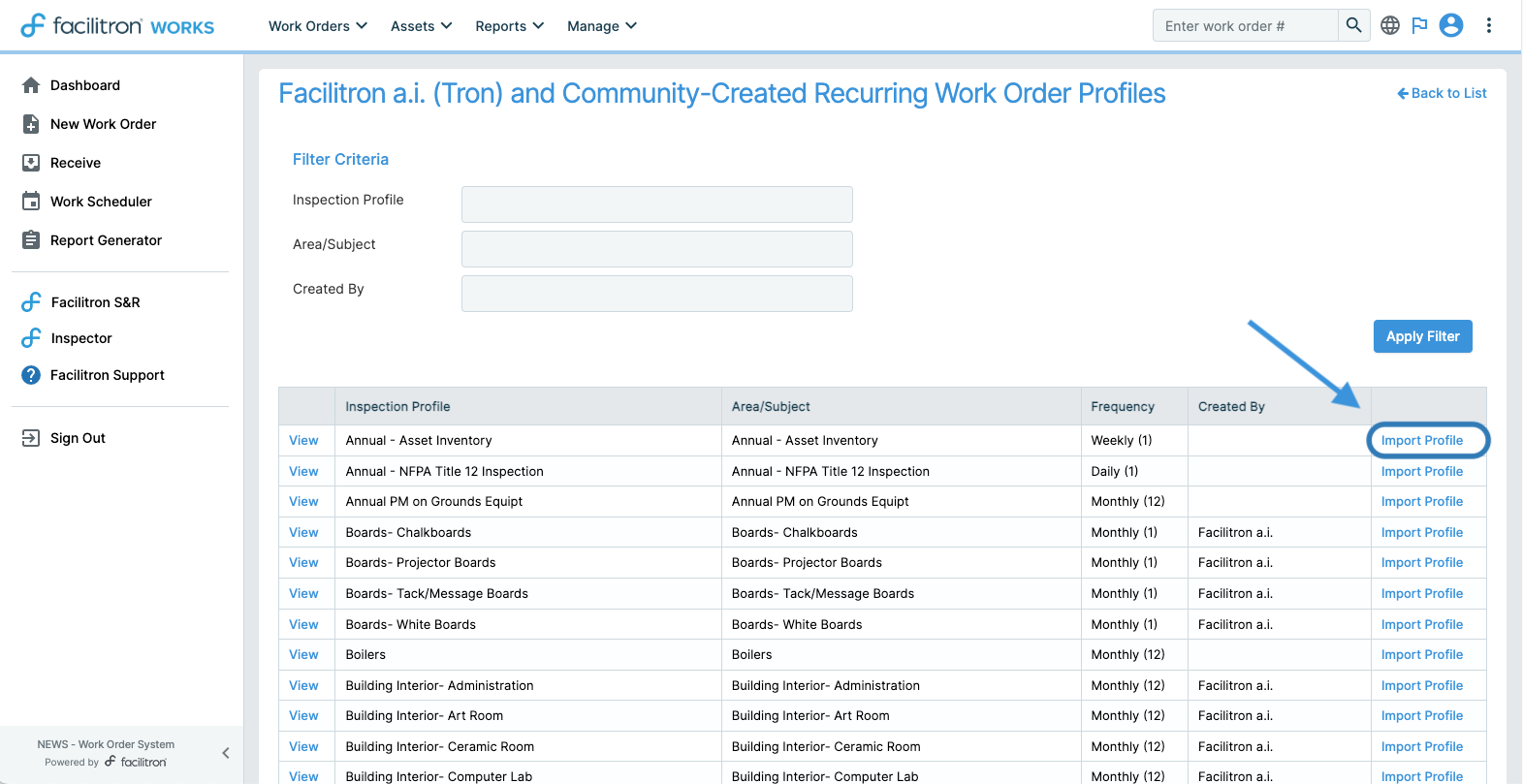 Community-Created Recurring Work Order (RWO) Profiles are pre-made RWO templates that can be imported and edited locally for district or site-specific needs. The feature was created to allow Facilitron partners to build custom RWO profiles and share them with neighboring districts. This concept allows Facilitron to create "standard" inspections that are industry-based.