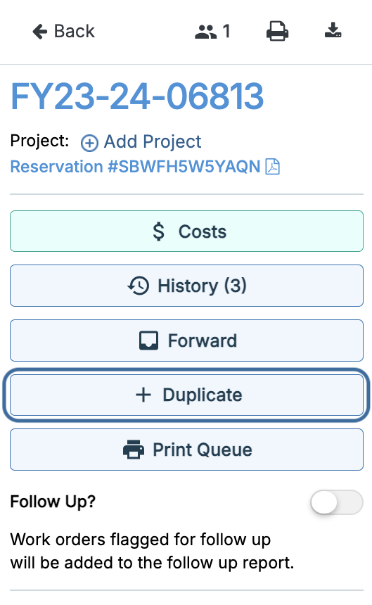 To duplicate a work order, go to the work order that you would like to duplicate, and click Duplicate.