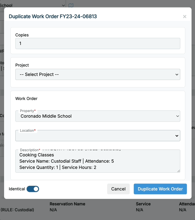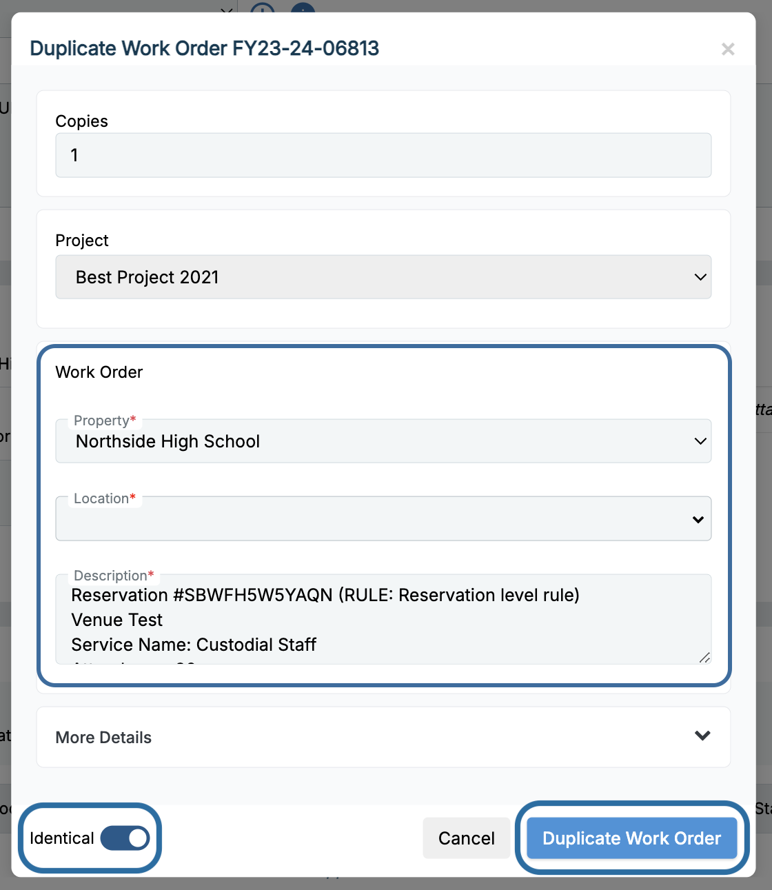 The following popup will open. Enter the number of duplicates you would like to create in the Copies field. 1 will be selected by default. Next, select an existing project if the work orders are part of a project, and enter the work order information. The property, location, and a description are required in order to duplicate the work order. A purpose is also required and is automatically filled in under the More Details section. You can update it here if needed and add the trade, work category, or other details if necessary. The purpose will match the purpose of the work order being duplicated. Identical means all new copies are identical to each other, not to the original work order. You can modify any details from the original but not between the new copies.