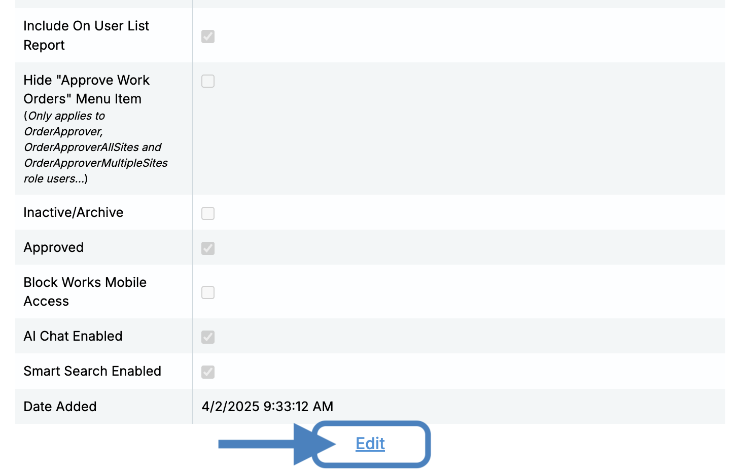Search for the user that you are disabling Smart Search for. Click on their name to access their user profile. Once you’re in the profile, scroll towards the bottom and click Edit.