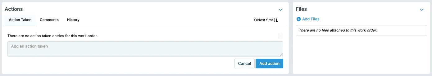 The Actions Taken tab is where any work performed for the work order is documented. At least 1 action taken should be logged before closing a work order. If the Actions section is not populated and no files have been uploaded yet, you may see limited activity displayed on the work order.