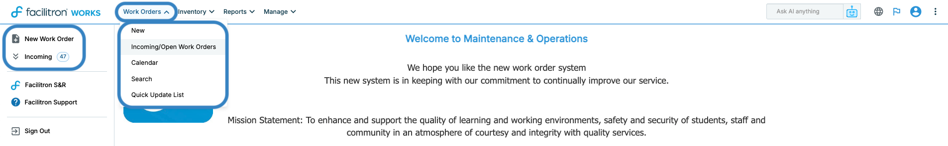 The New and Incoming shortcuts are located on the left-hand side of the screen for quick access. You can also access these shortcuts, along with additional options, from the Work Orders menu bar.
