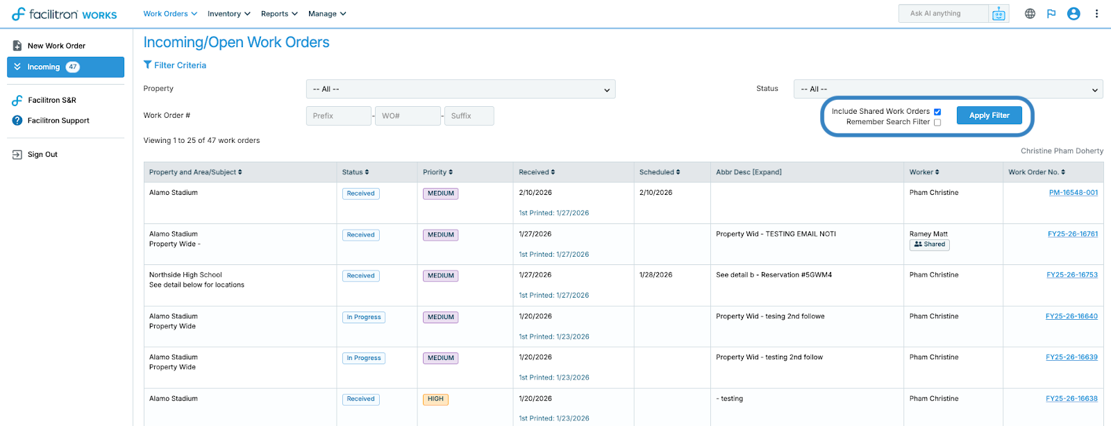 The Shared Work Orders option provides visibility into shared responsibilities and team workload. Check the box next to Include Shared Work Orders to view work orders assigned to other staff members within your trade or crew (if applicable).