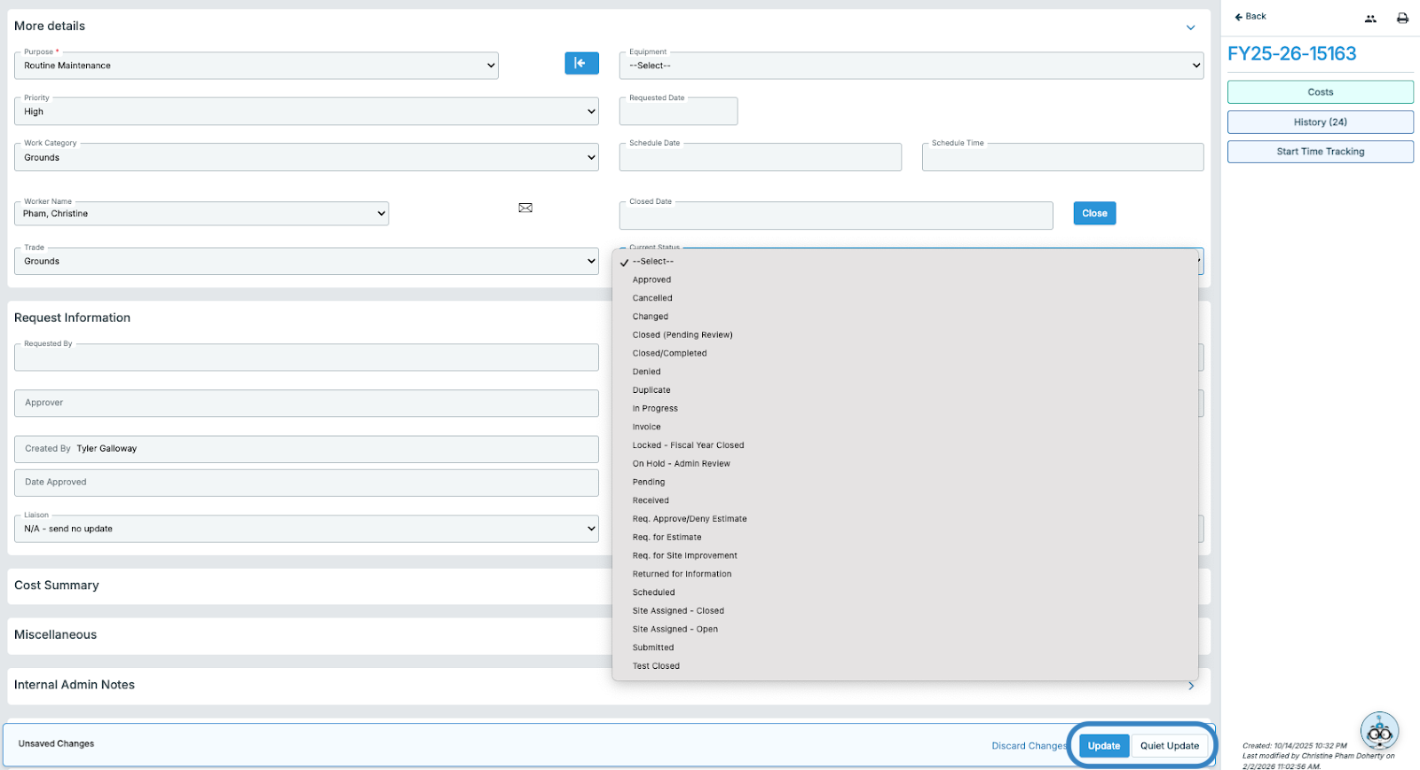 As progress is made, update the status of the work order when applicable. To change the status, open the work order from the Incoming screen or search results. Locate the Status field, and select the appropriate status from the dropdown menu.