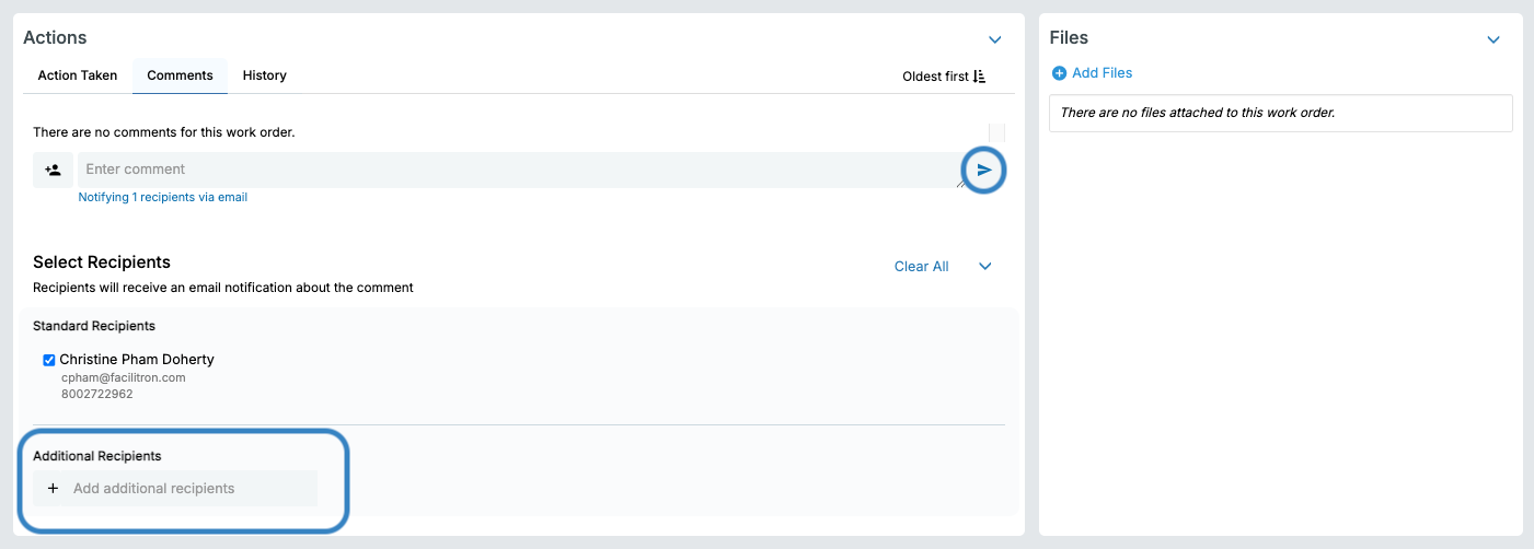 The Comments section allows you to communicate directly within the work order. You can notify select recipients with an email notification by checking the box next to their name, or by typing in the name of the recipients in the Additional Recipients field. After selecting recipients, press the blue arrow to leave the comment and notify the recipients that a comment has been left. The email notification will include a link to the work order, where the recipients can review and respond.