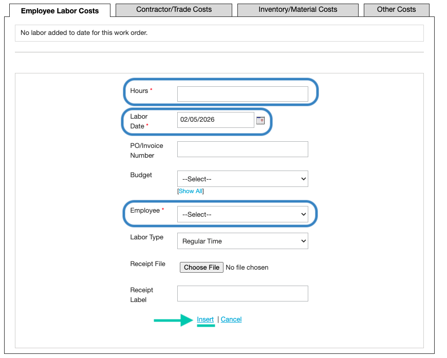 Defaults to today’s date. Adjust the date if the labor was performed on a different day. - Employee