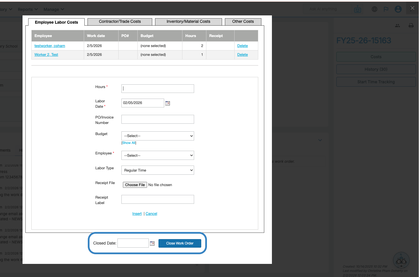If the work order is complete, you can close the work order directly from the Costs screen. Select Close Work Order. Before closing, be sure the close date is accurate. The close date will default to today’s date. If needed, use the calendar tool to adjust to a different date.
