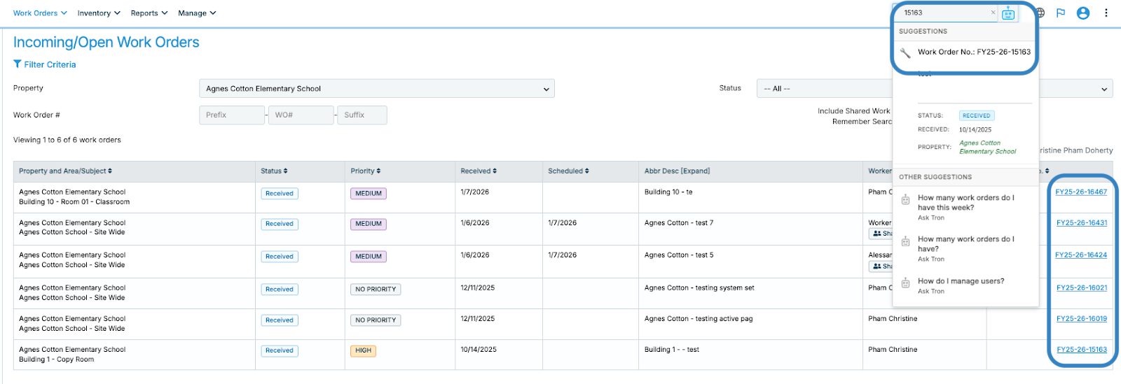 To locate a specific work order, enter the work order number (for example, 15163) in the Search field at the top right of your screen. Once selected, the work order will open in a pop-up window displaying key details.