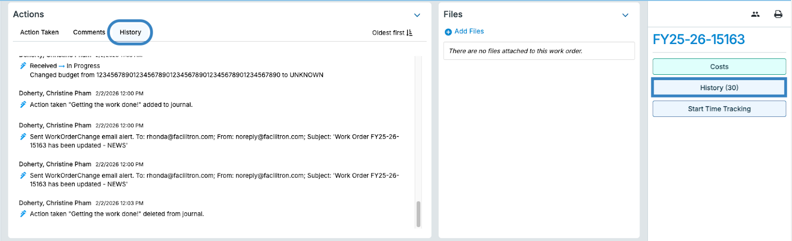 The History section provides a complete log of all status changes, comments, file uploads, and other updates made to the work order. You’ll also find a confirmation of which users were notified by email for each update.