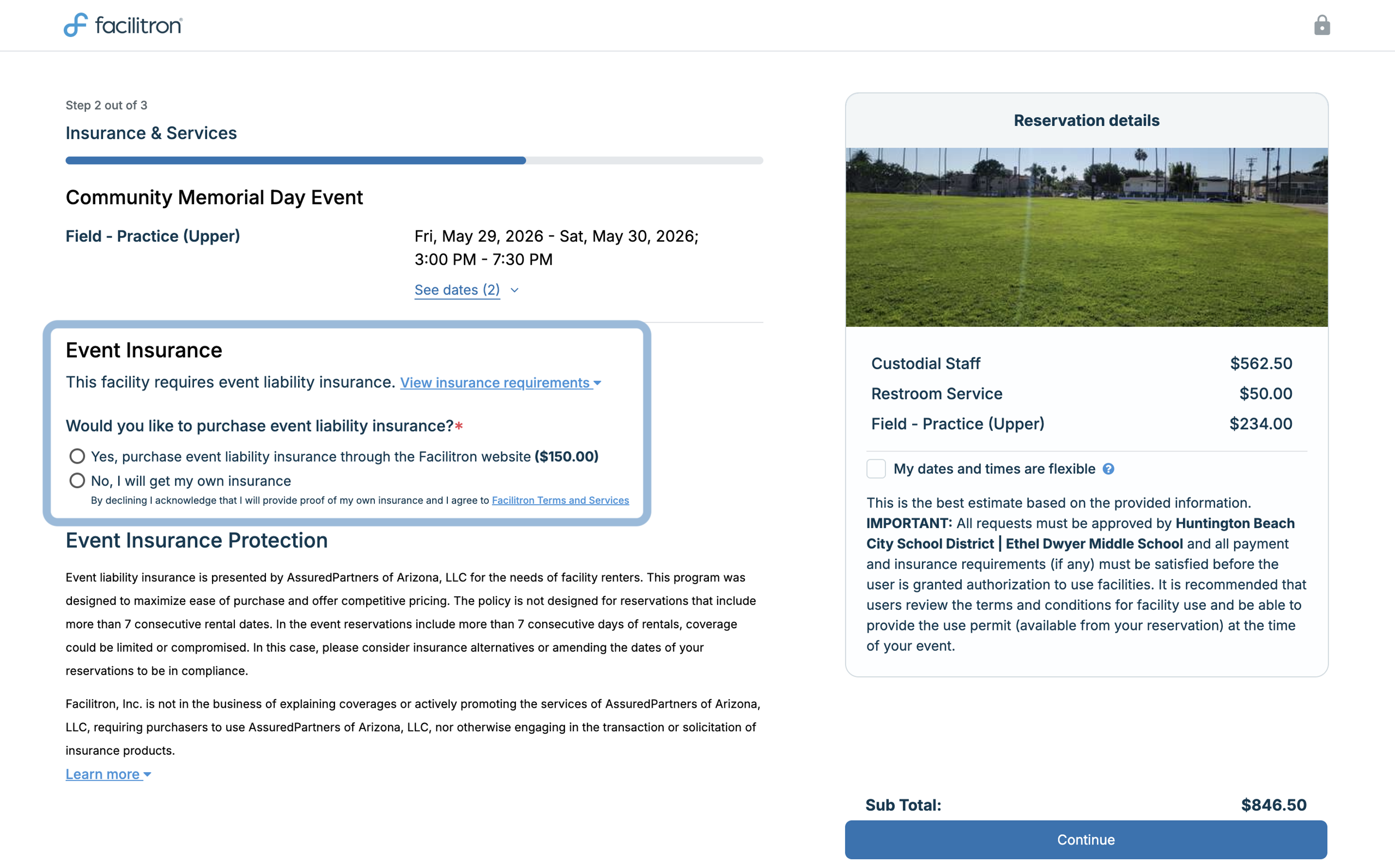 According to the facility owner’s policies, full payment may be due at checkout when Facilitron Insurance is added. Additional application questions from the insurance agency may also be added.