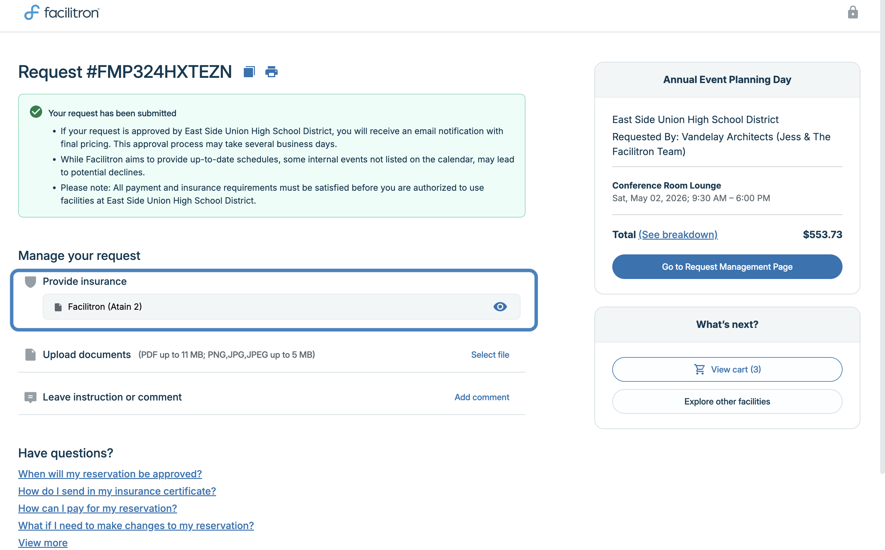 This article explains how facility renters can purchase Facilitron insurance during and after checkout. For assistance with with submitting a reservation request, please see Submitting a Reservation Request. To upload your organization’s existing insurance coverage, see How Do I Upload My Certificate of Insurance (COI)?.
