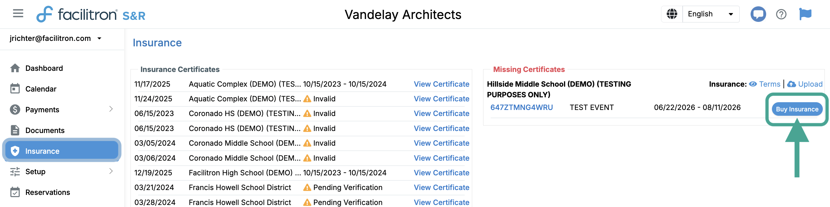 To add Facilitron Insurance after checkout, log in to your Facilitron account and go to the Insurance page. Click the Buy Insurance button on the right side of the page.