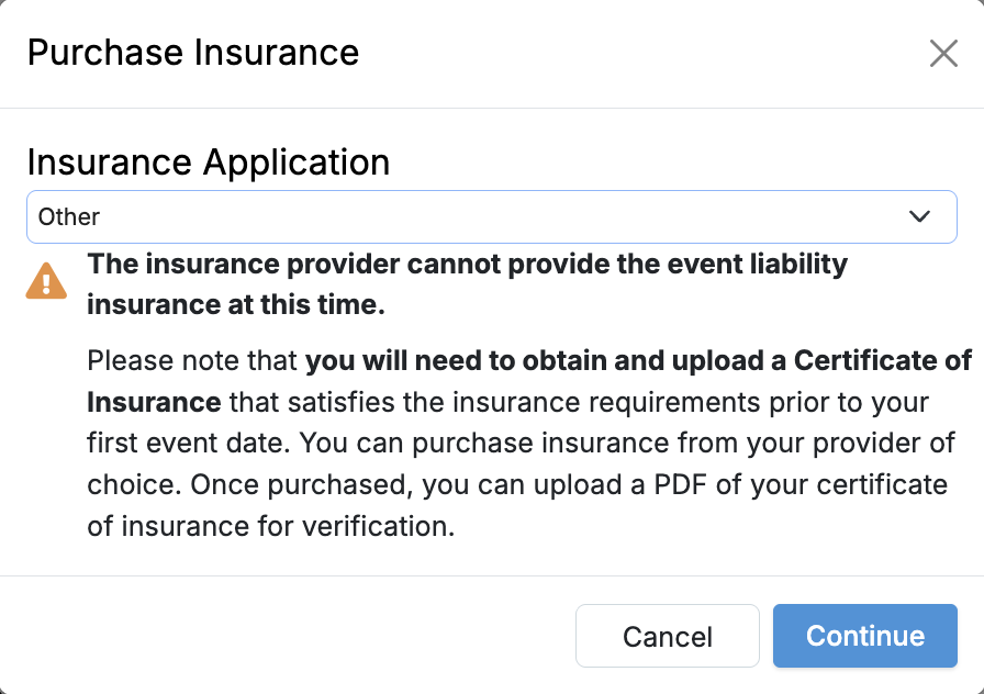 If Facilitron Insurance is unavailable for the reservation, the following modal will open, showing confirmation that Facilitron Insurance is unavailable and a Certificate of Insurance (COI) must be provided.